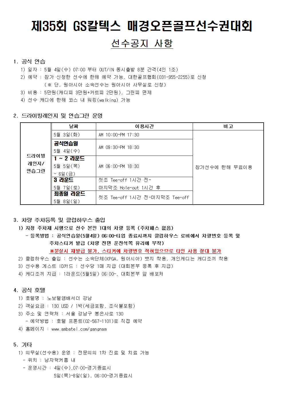 제35회 GS칼텍스 매경오픈골프선수권대회 선수 공지사항