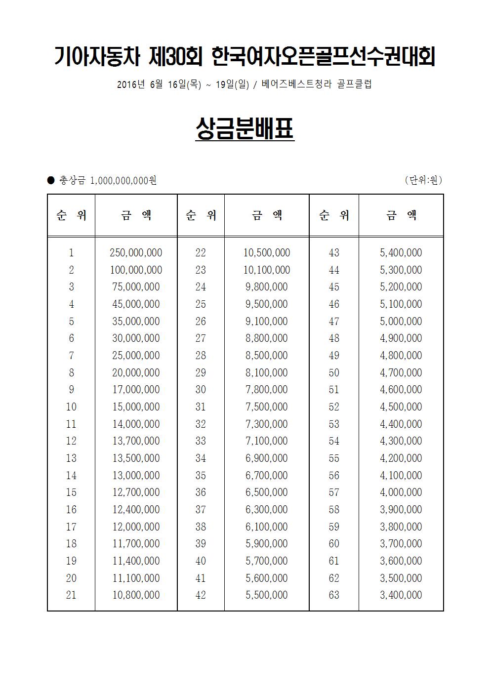 [상금분배표] 기아자동차 제30회 한국여자오픈골프선수권대회