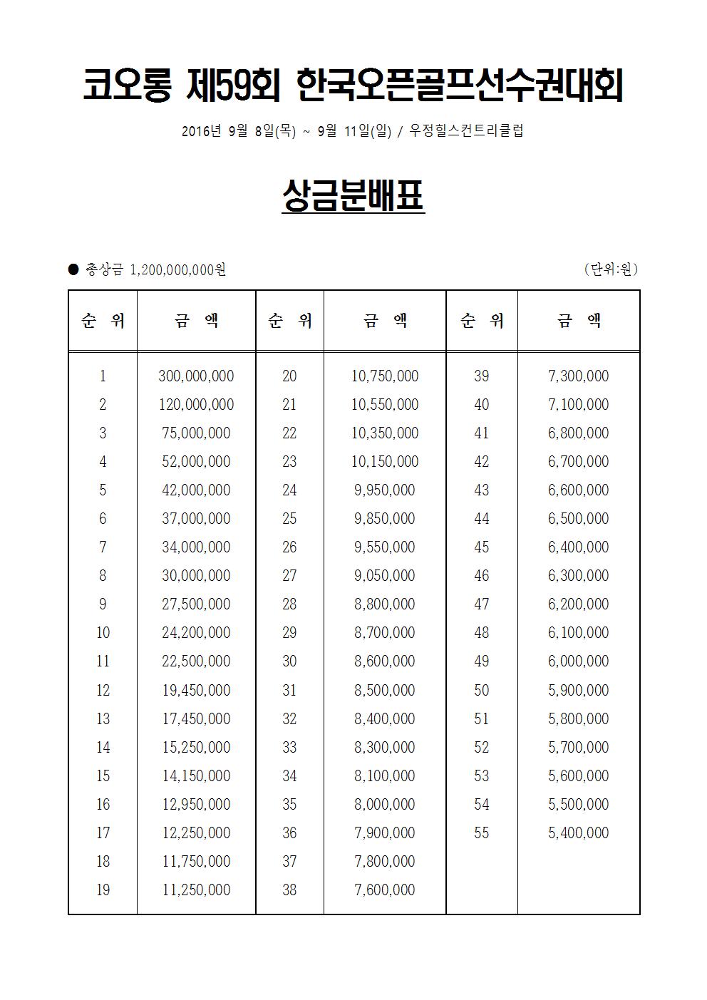 코오롱 제59회 한국오픈골프선수권대회의 상금분배표를 위와 같이 공고합니다.