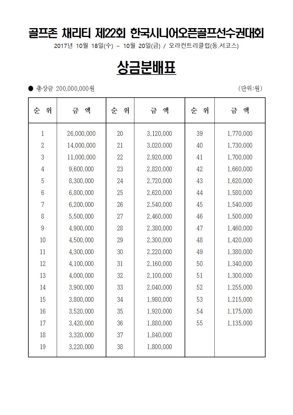 [상금분배표] 골프존 채리티 제22회 한국시니어오픈골프선수권대회