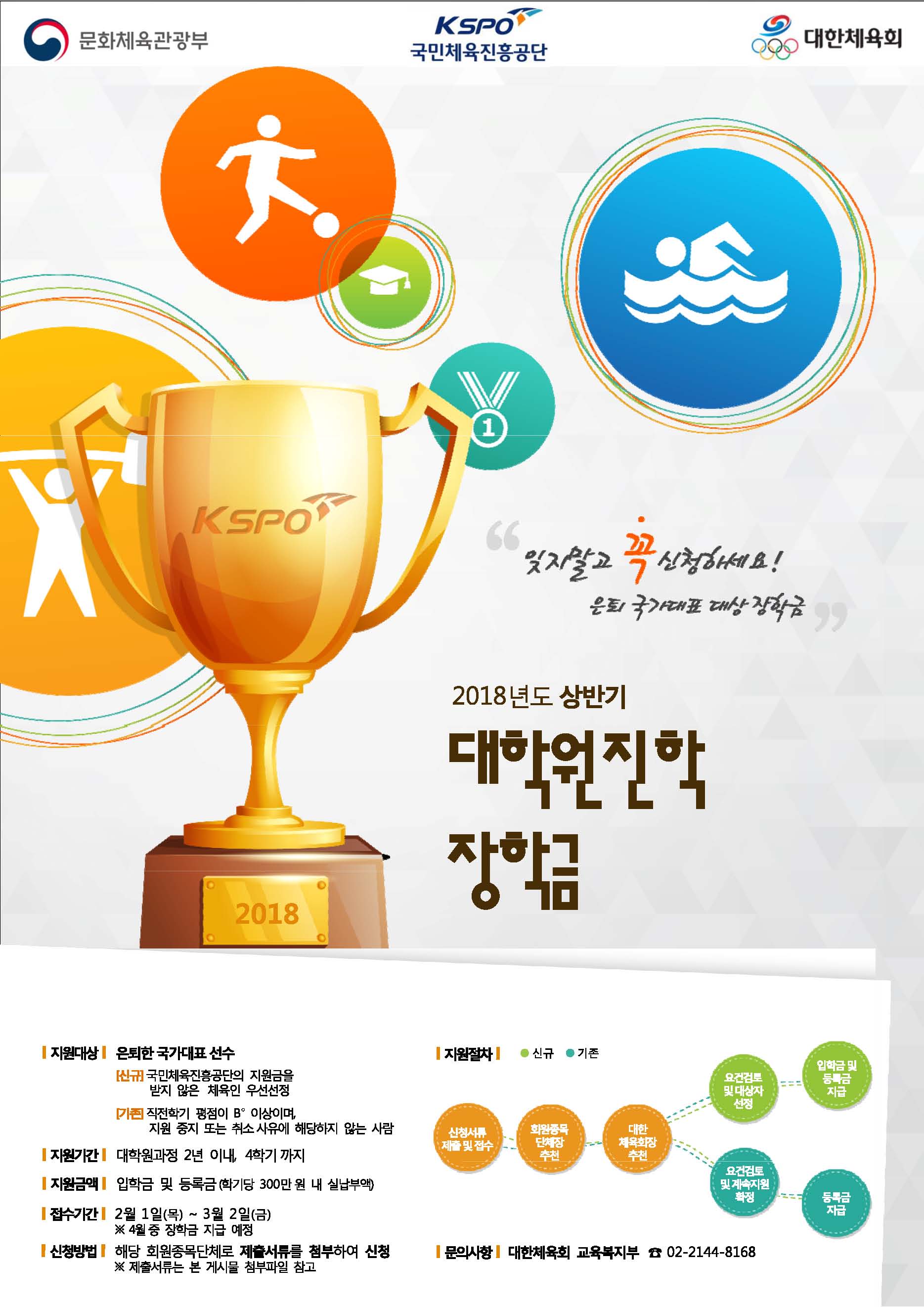 2018년 상반기 대학원진학장학금 지원대상자를 아래와 같이 모집하오니 희망자 중 자격에 충족되는 은퇴선수는 당 협회(신현숙 과장 031-955-2255)로 문의하시기 바랍니다.