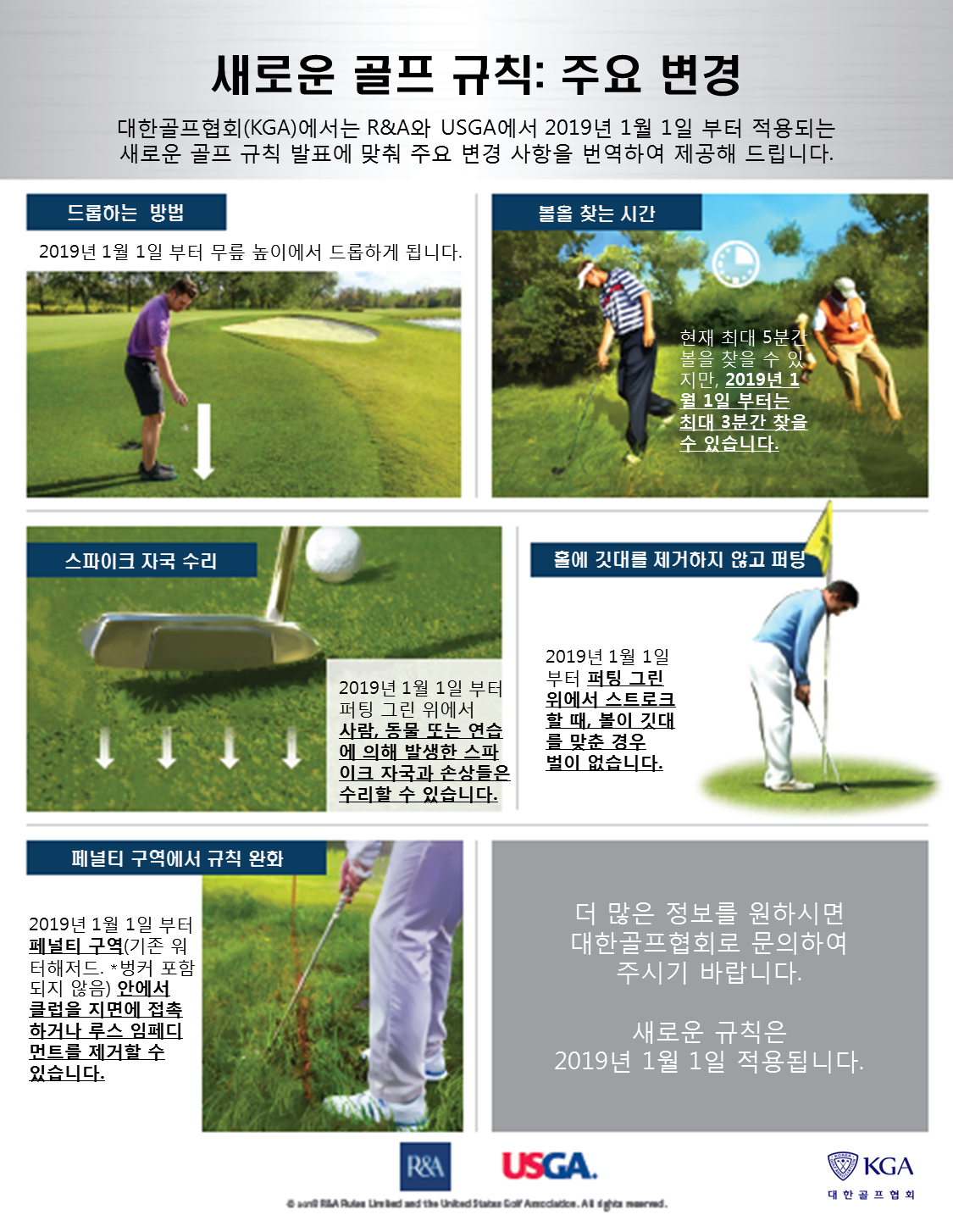 R&A와 USGA에서 발표한 2019년 1월 1일 부터 적용되는 새로운 골프규칙 중 주요 변경 사항에 대한 그래픽 자료입니다.