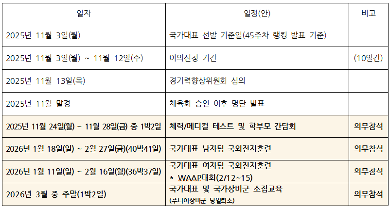 □ 2026년도 국가대표 선발 이후 의무 참석 일정(안) ※ 국가대표 선발 이후 일정은 국가대표 선수단의 의무참석 일정을 공유하기 위한 초안 사전공지로 경기력향상위원회 심의 후 최종 확정됨.