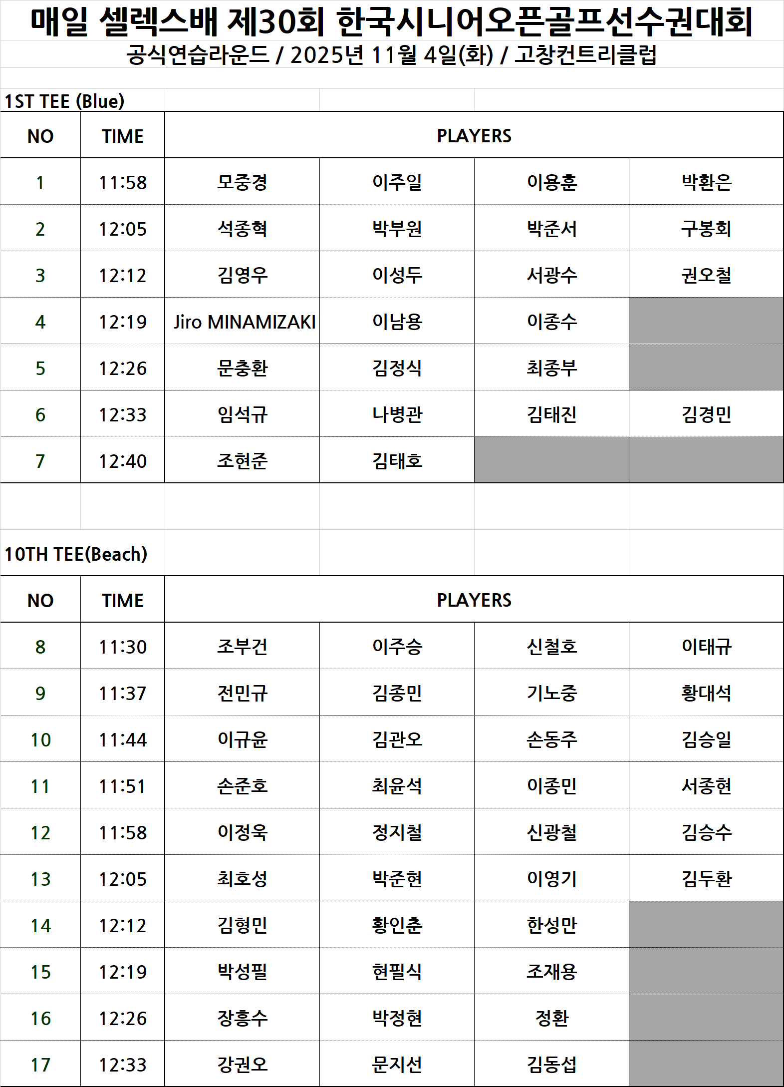 [매일 셀렉스배 제30회 한국시니어오픈 본선] 1R 조편성(안)
