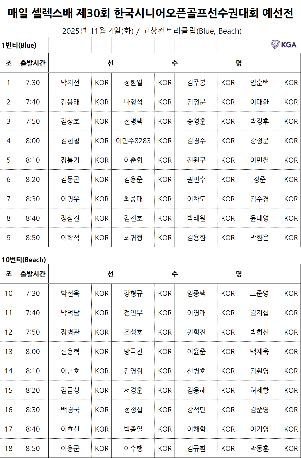 [매일 셀렉스배 제30회 한국시니어오픈 본선] 1R 조편성(안)